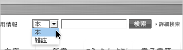 「書籍」または「雑誌」のどちらかを選択していただき、検索したいキーワードを入力して「検索」ボタンをクリックします。