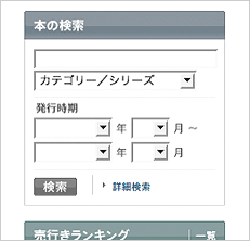 詳細検索ページからは、より詳細な条件で絞込み検索をおこなうことができます。書名や著者名、キーワードだけでなく、発売時期やカテゴリ/シリーズなどでよりピンポイントにお探しの本を見つけることが可能です。